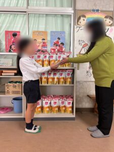 近年、新型コロナウイルスが蔓延していた当時よりも感染対策は緩みつつありますが、コロナウイルスなどへの感染予防対策として、液体石鹸の方がより手洗いができるということで、今年度もハンドソープ詰め替え用900ml×83袋を購入し、児童代表の保健委員長さんへお渡ししました。